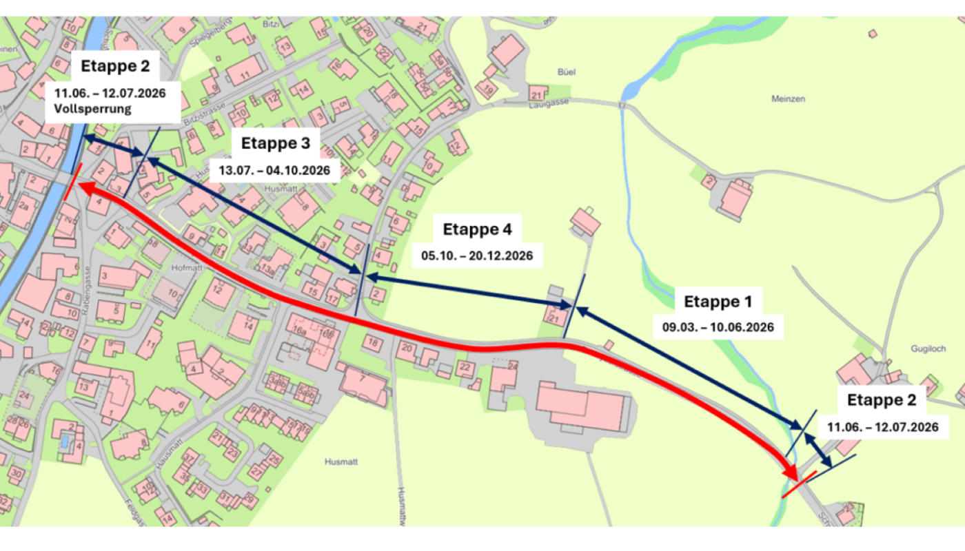 Die Bauhauptarbeiten dauern voraussichtlich vom 9. März 2026 bis am 20. Dezember 2026 (witterungsabhängig).