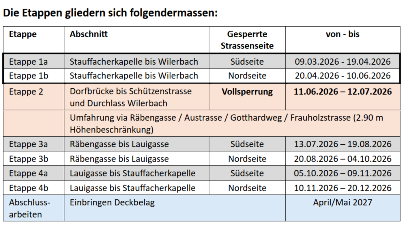 | Etappe 4b | Lauigasse bis Stauffacherkapelle | Nordseite | 10.11.2026 – 20.12.2026 |